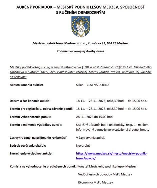 Mestský podnik lesov Medzev, s. r. o., vyhlasuje verejnú dražbu dreva (aukciu), ktorá sa bude konať v dňoch: 18. 11. – 26. 11. 2025, každý deň so začiatkom o 8,30 hod.