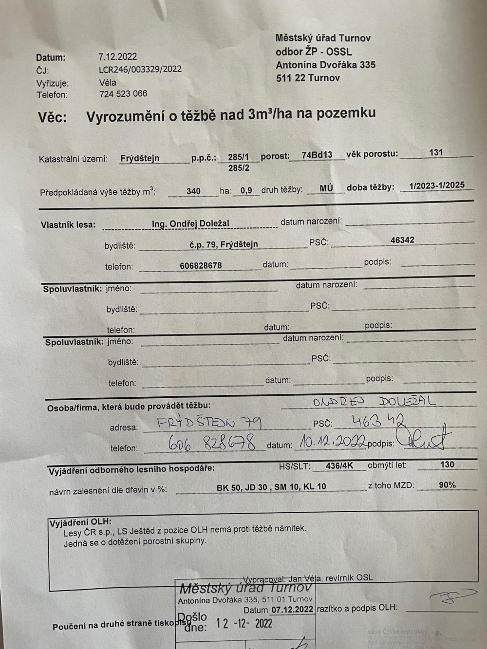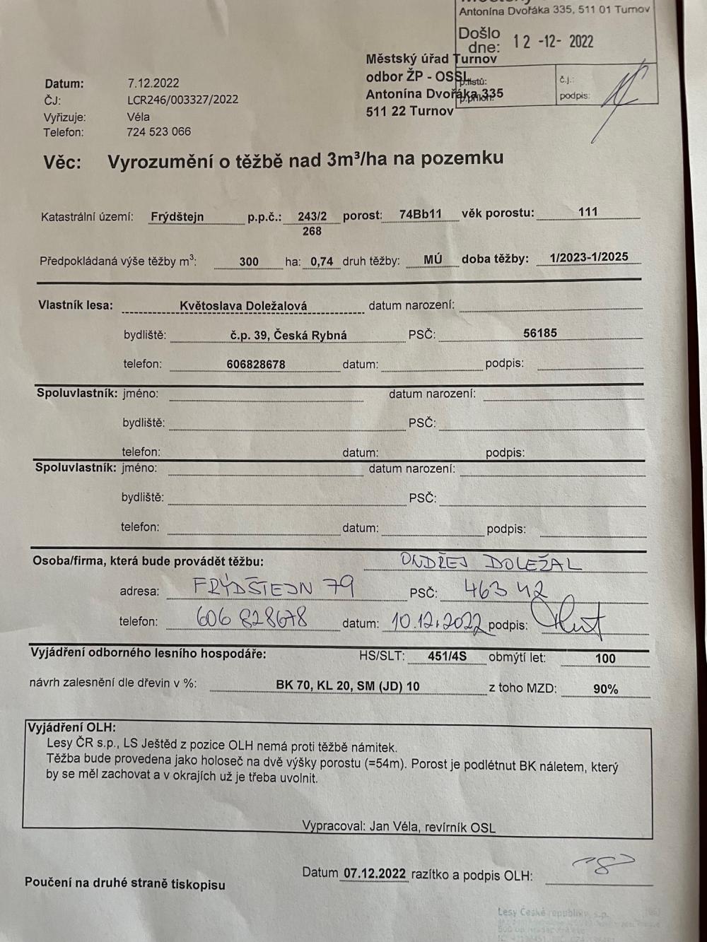 Nabízím k prodeji na stojato a vytěžení MÚ cca. 650 m3 dřevní hmoty, stáří 110-130, dva samostatné celky, jeden s převahou BK 90, SM,BO 10, druhý SM 80, BO 10, BK 10. Jednoduše přístupný pozemek, rovinatý až mírně svažitý, přiblížení 1) 0 m 2) 500 m. Lokalita Frýdštejn u Turnova https://mapy.cz/zimni?vlastni-body&ut=SM80Bo10%2CBK%2010&ut=BK%2090%2C%20SM%2010&uc=9iG5Rx1GB-hC1e9A&ud=50%C2%B038%2749.485%22N%2C%2015%C2%B09%2753.158%22E&ud=50%C2%B038%2738.365%22N%2C%2015%C2%B010%2714.015%22E&x=15.1686929&y=50.6460654&z=16&base=ophoto . Požaduji platbu v hotovosti při odvozu.