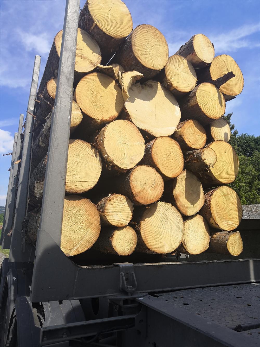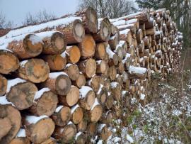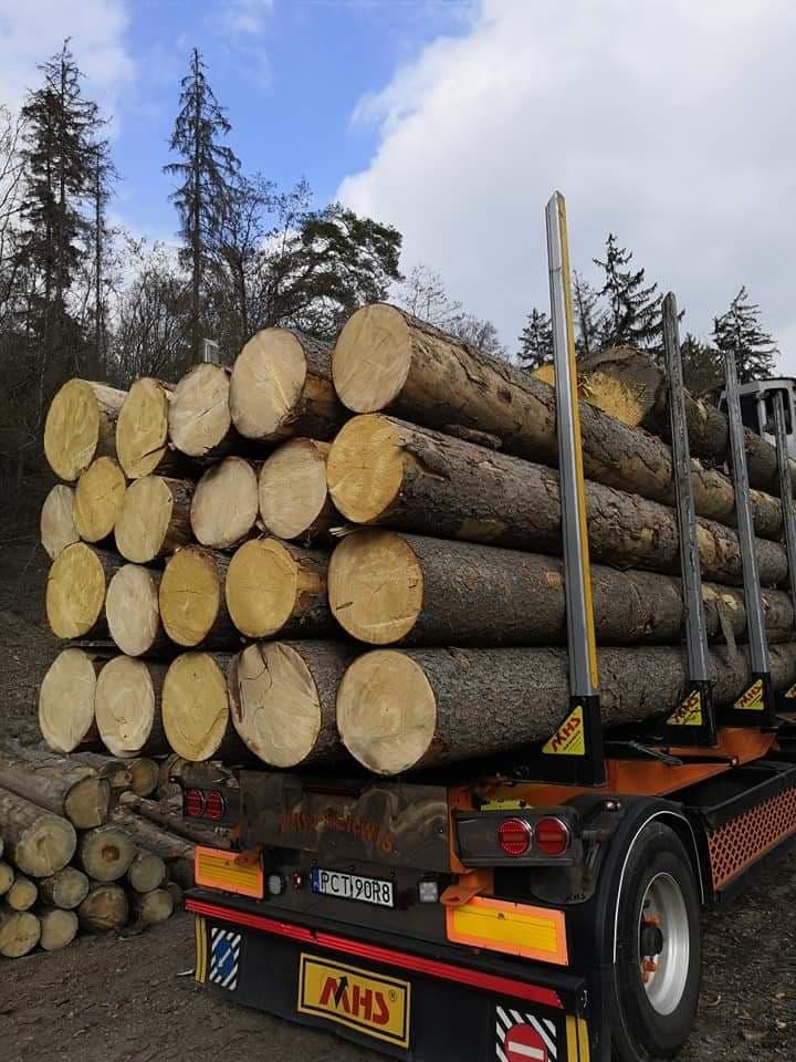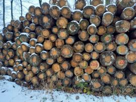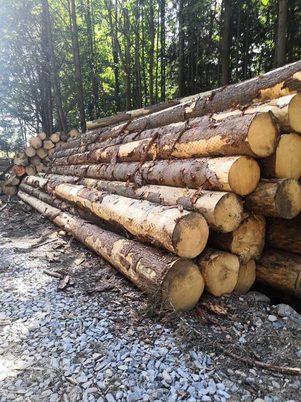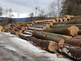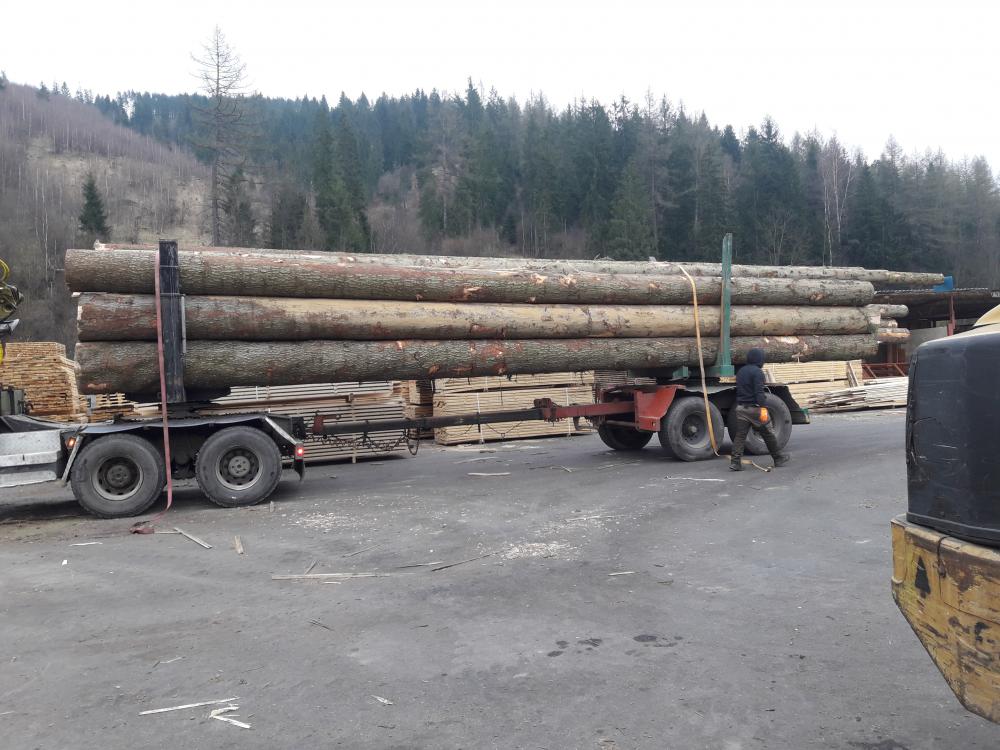 smrek, tenký koniec 25 cm, hrubý koniec do 65 cm, dĺžky ca 80% 5m, zvyšok 4 m, možné aj združené výrezy