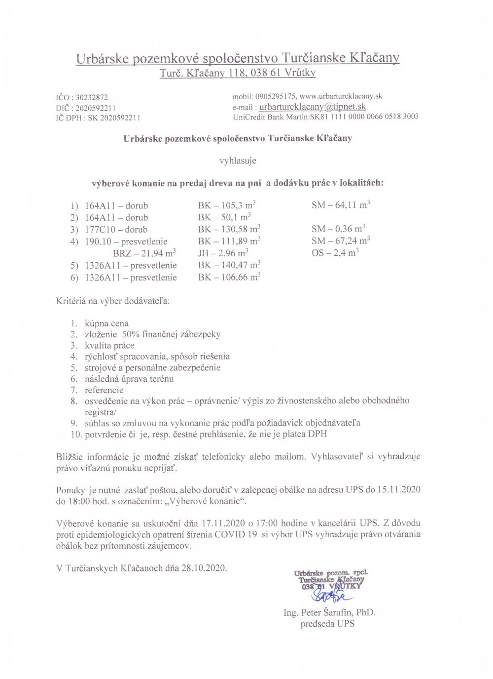 Bližšie informácie je možné získať telefonicky alebo mailom. Vyhlasovateľ si vyhradzuje právo víťaznú ponuku neprijať.