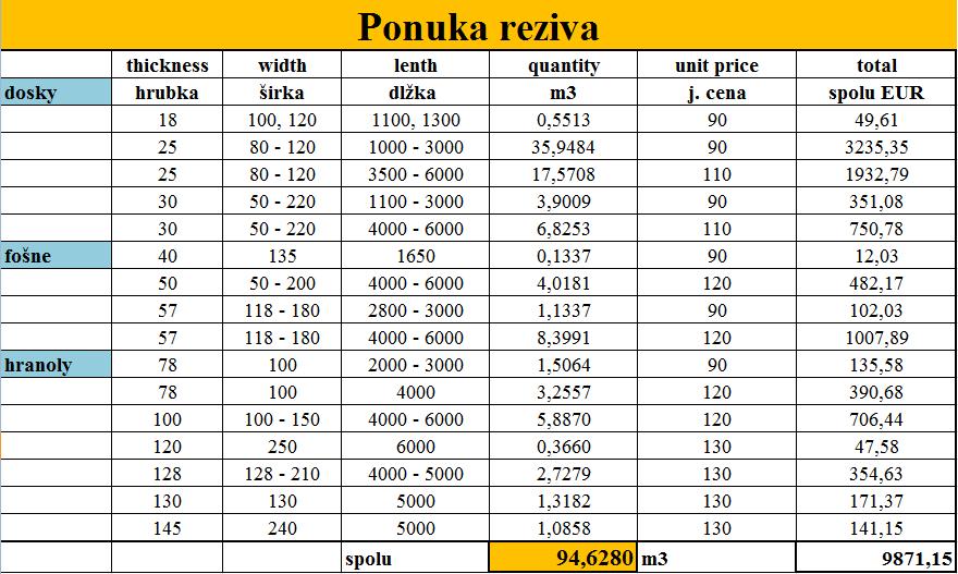 Ponúkam na predaj rôzne druhy exotického reziva, hranolov a guľatiny v zmysle tabuľky v prílohe. Dovoz na Slovensko je zabezpečený. Rezivo je vzduchosuché z lesa, nie z plantáže v max. dĺžke 2,7bm. V prípade záujmu je možná aj dodávka cenovo výhodnejšieho reziva z plantáže, prevažne teak.