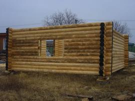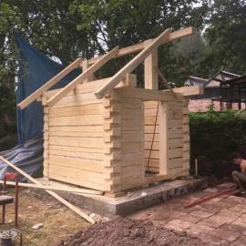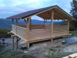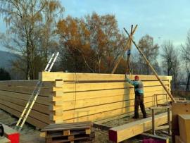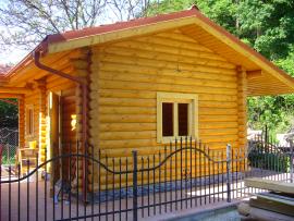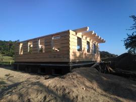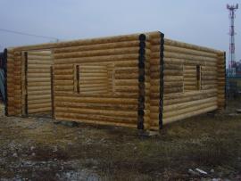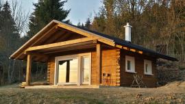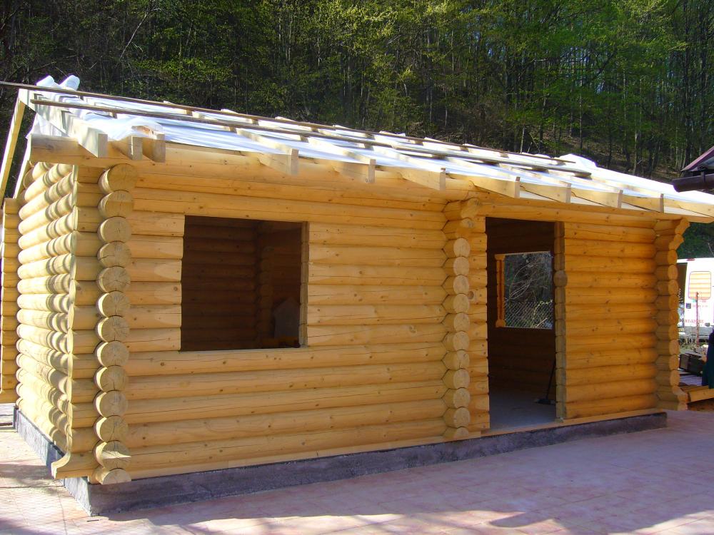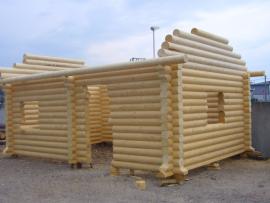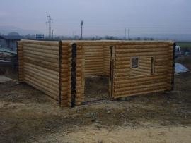Zrubová chata (skelet) prízemná, zast. plocha 4,2x7m z fréz. guľatiny priemer 20cm až do štítov so sedlovou strechou (krokvy+klieštiny,zafóliované, zalatované, bez krytiny), výrezy na okná, dvere, s montážou, bez základovej platne a dopravy.
