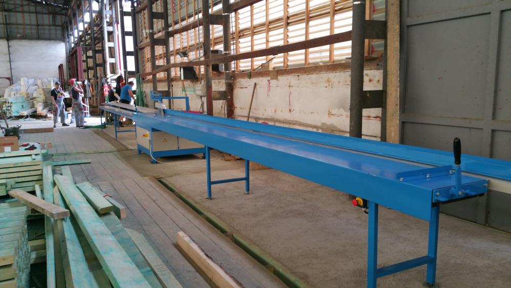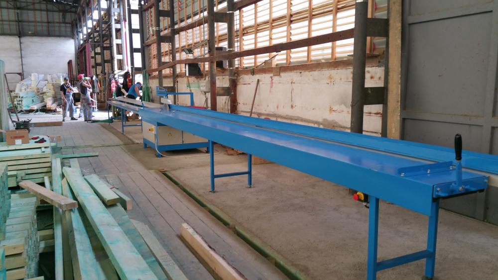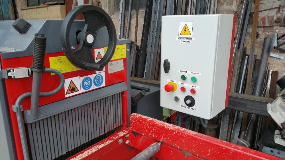 Kotoučová pila typ T-400 je kvalitní a propracová Hranolovací pila Pila je vyrobena tak,abychom dosáhly co nejefektivnější vlastnosti řezání.Za tímto účelem jsou na tělese stroje upevněny dva posuvné motorové pláty, na kterých jsou umístěny dva motory vybavené pilovými vřeteny.Tímto způsobem získáme možnost velmi rychlé a snadné změny tloušťky řezané středové prizmy bez nutnosti demontáže pil.V pořadí přes použití mechanizmu povolujícího změnu pozice stolu podacího-příjmacího ve svislé rovině získáme možnost rovnoměrného zatížení motorů dolních pil a motorů horních pil dovoluje velké zvýšení výkonnosti stroje.Díky mechanizmu a také upevnění pil bezprostředně na vřetenech umístěných na motorových válcích( nedostatek řemenových převodů),rovněž získáme zmenšení spotřeby elektrické energie.V podacím-příjmacím stolem je umístěn speciálnÍ ocelový žlábek,ve kterém je umístěn řetěz podavače vybaven skládacími žabky (upínáky), které řezané dřevo ho posouvají ve směru řezacích pil.Rozpojující zarážky (klíny) umístěné bezprostředně za řezacími pilami zabezpečují řezaný materiál před rozštěpením a také před neočekávaném vyhození dřeva.Pilové kotouče nejsou součásti pili v základu -za příplatek. Průměr pilových kotoučů 500 mm Max. průměr řezané kulatiny 380 mm Min. průměr řezané kulatiny 100 mm Max. průměr prostřední pryzmy 160 mm Min. průměr prostřední pryzmy 60 mm Max. počet pilových kotoučů po 2 kusech na každém motoru Průměrná díra na kotouči 60 mm Síla motorů 4,kusy x 7,5 Kw Otáčky motorů 1450 obr./min. Příkon motoru posuvu 1,1 Kw Otáčky motoru posuv 1450 obr./min Rychlost posuvu 0-20 m / min. Napětí 3 x 400V, 50Hz Výkon stroje do 10m³\h Hluk pily v provozu 92,6 ± 1,8 [dBA] Hluk pily 103,8 ± 1,0 [dBA] Rozměry, délka-šířka-výška 6000 x 1400 x 1700 mm Váha stroje 1100 kg Za příplatek silnější motory o výkonu 4 x 11Kw Více zde: http://www.drevoobrabeci-stroje.eu/products/hranolovaci-pila-t-400-4-motorova-prorez-380mm-/
