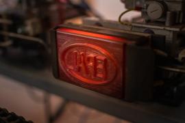 Zobrazovanie rezu vodorovného a zvislého pílového kotúča na kmeni laserovým lúčom červenej a zelenej farby.