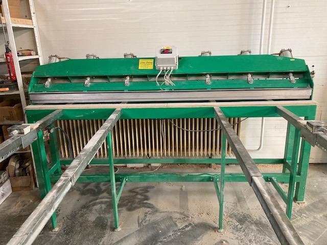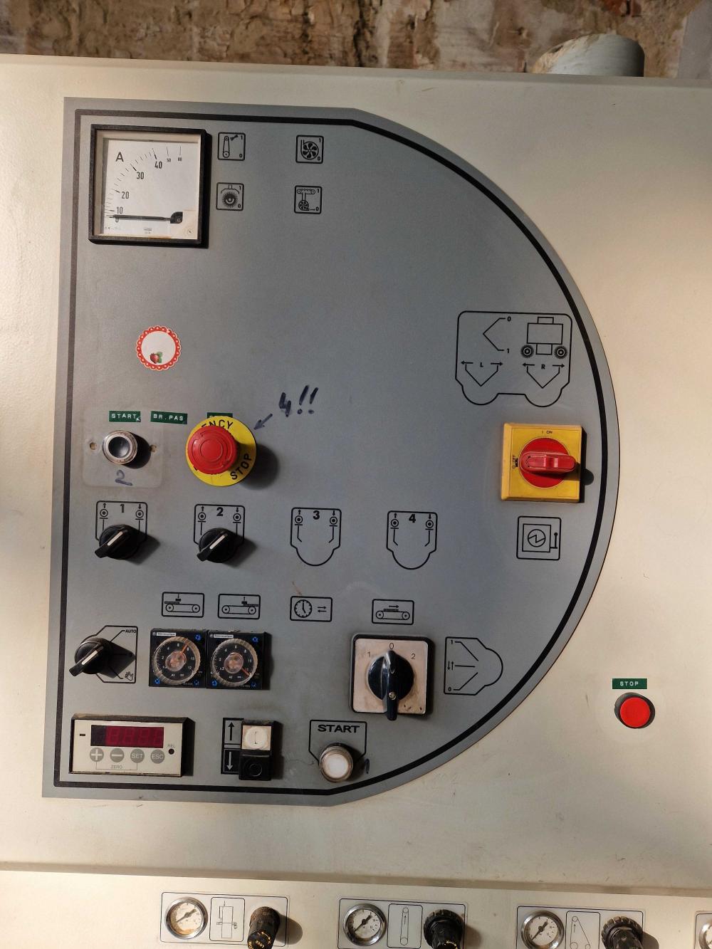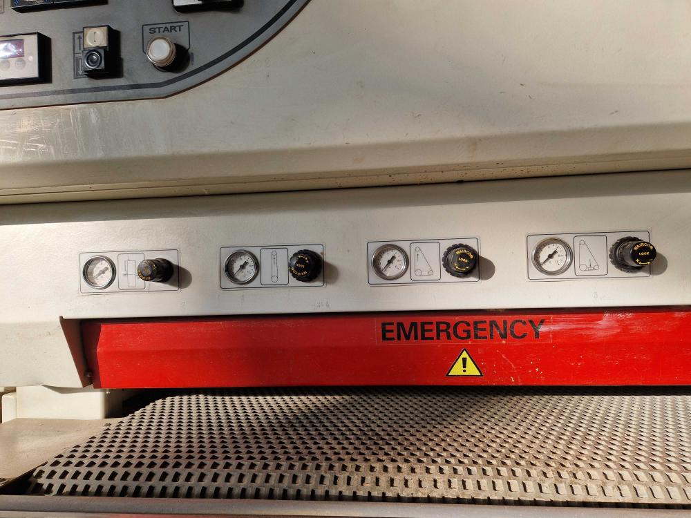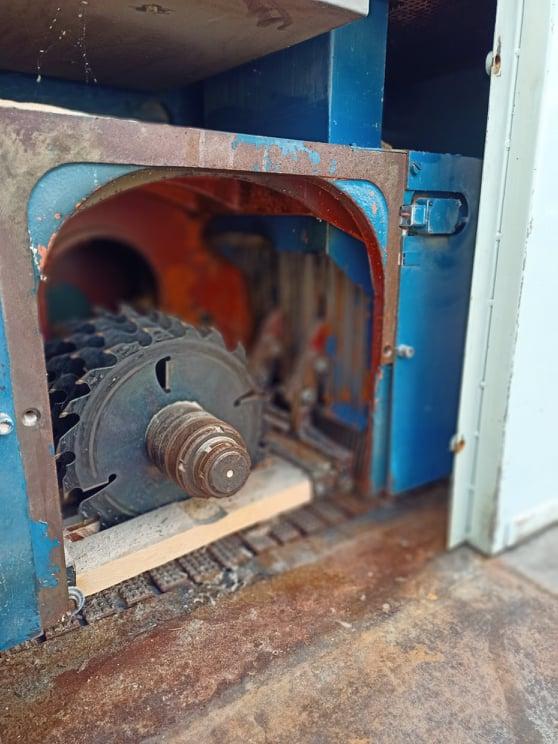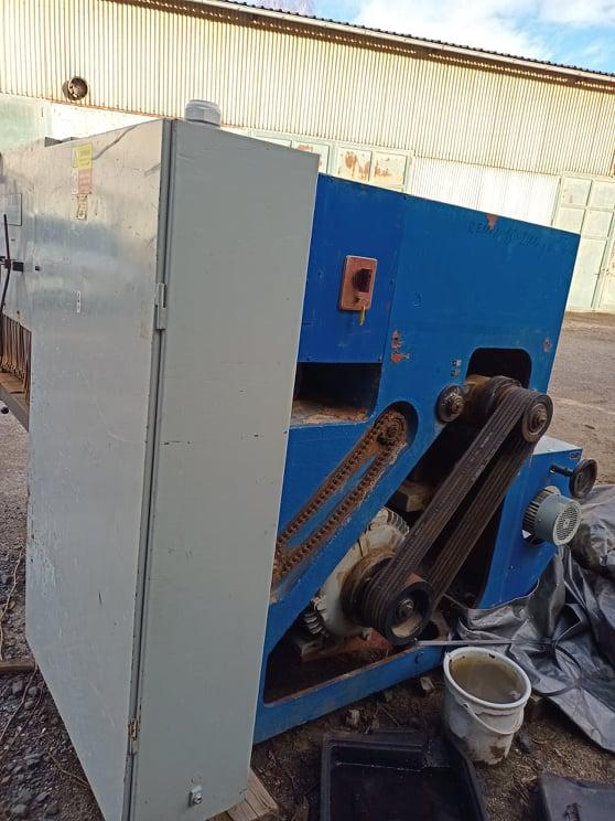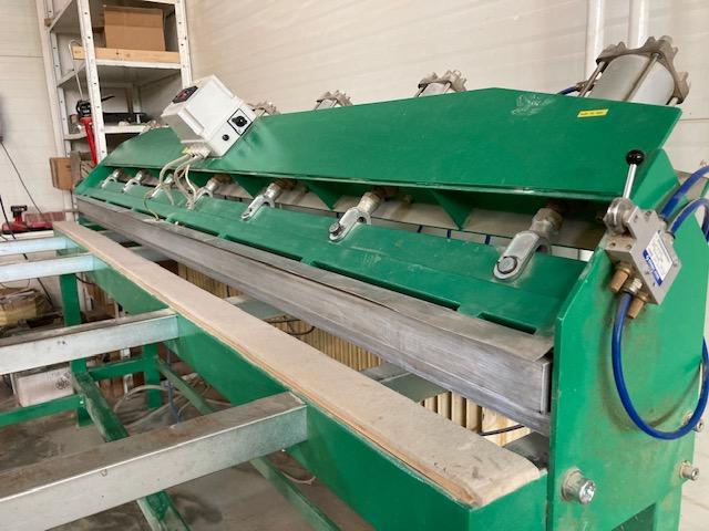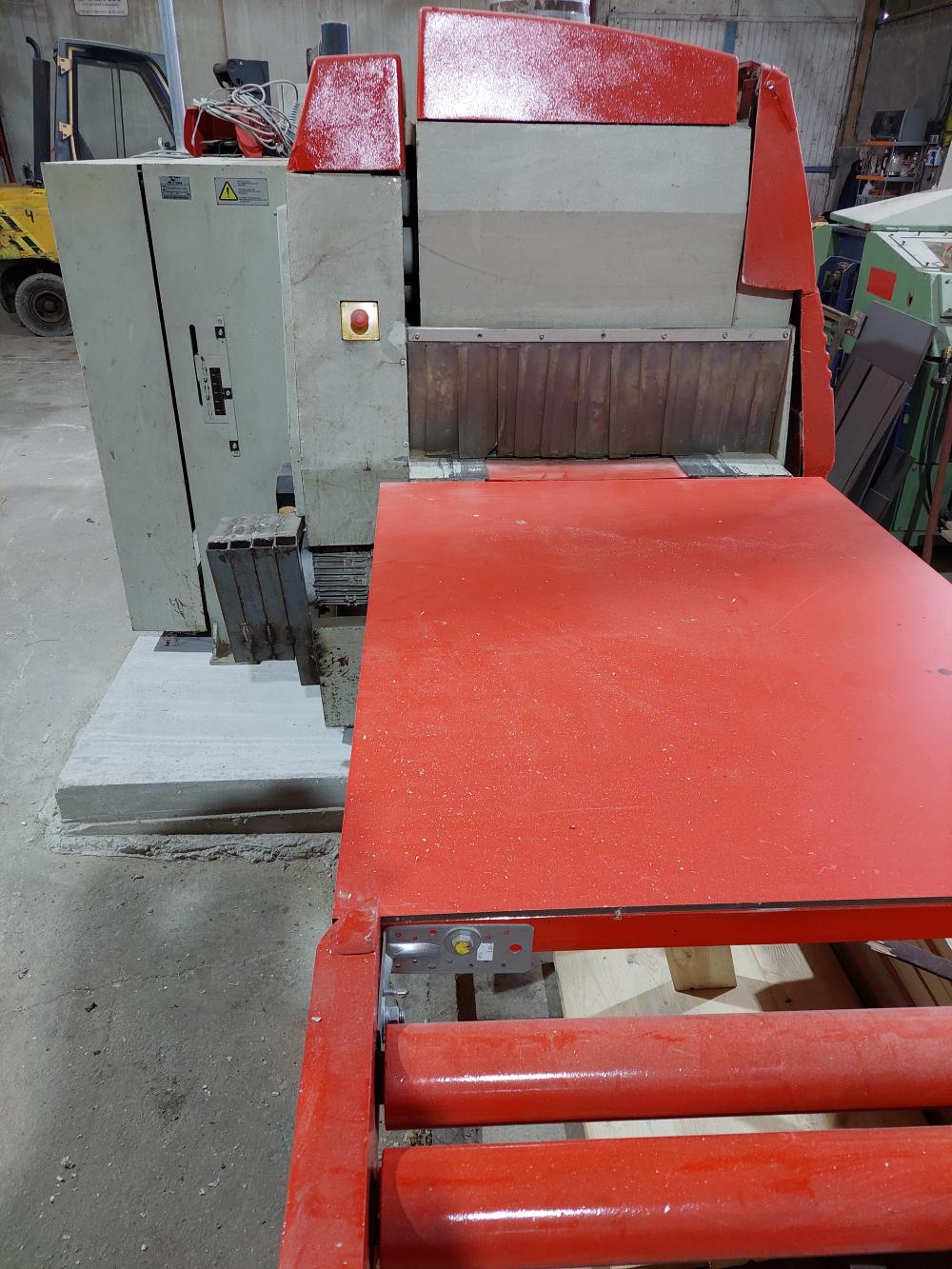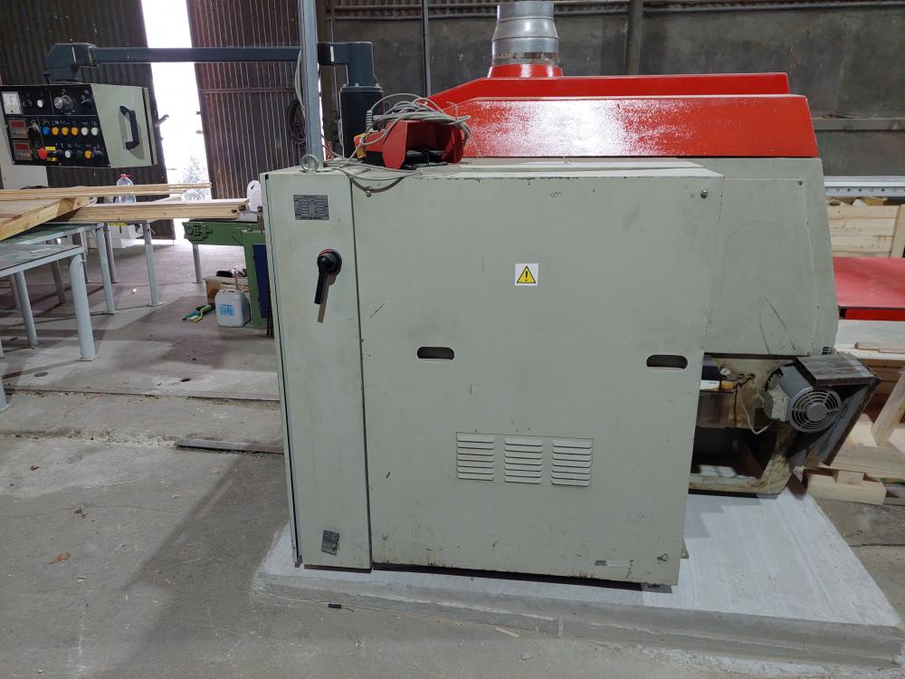 Kmenová Pásová Pila Průmyslová TS-1200/60 výkon hlavního motoru - 30,0 KW příkon - 37- KW (v plné výbavě) napětí napájení - 380V, 50H posuv podél řezací hlavice oboustranný - plynulý měnič 0-40 bm min posuv napínacího válečku elektrický vodící kola 800/43 mm ovládací panel stacionární elektrický ventil chlazení pásů průsvit řezací hlavice - 420/1150 mm stacionární ovládací panel předřez vracení prken zpět k operátorovi šířka pilového pásu - 60 mm délka pilového pásu - doporučeno 5 600 x 60 x 1,1 rozteč zubů 25 mm tloušťka řezu -1,5-2,2mm Výkon pily 30m3/ za směnu, doporučujeme pilové pásy stelitované rozteč zubů 25mm