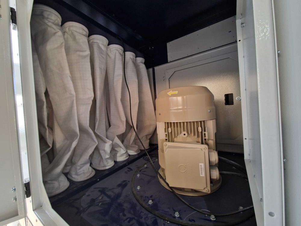 Transportní ventilátor V1500 - středotlaký ventilátor, odsává zplodiny ze svařování, chlazení apod. Lze použít samostatně, nebo jako součást jiných strojů. Robustní provedení pláště, svařovaný rotor. Montáž na zem, zeď, nebo rám stroje pomocí úchytných otvorů ve spodní části ventilátoru. Podtlak na vstupu 1450 Pa, odsávací kapacita 1500 m3/hod, sací hrdlo průměr 160mm, výstup 100x100mm. Nový typ hliníkového kvalitního přírubového elektromotoru 1,1kW - 2900 ot/min. Přívod 16A-5kolík.