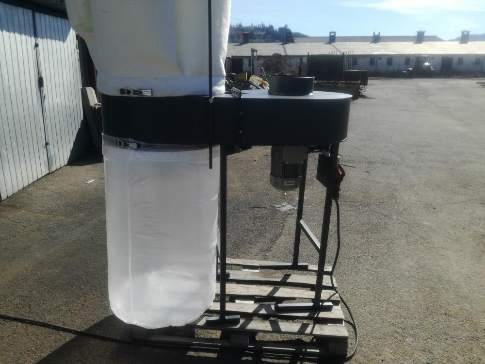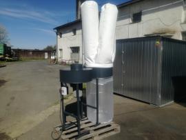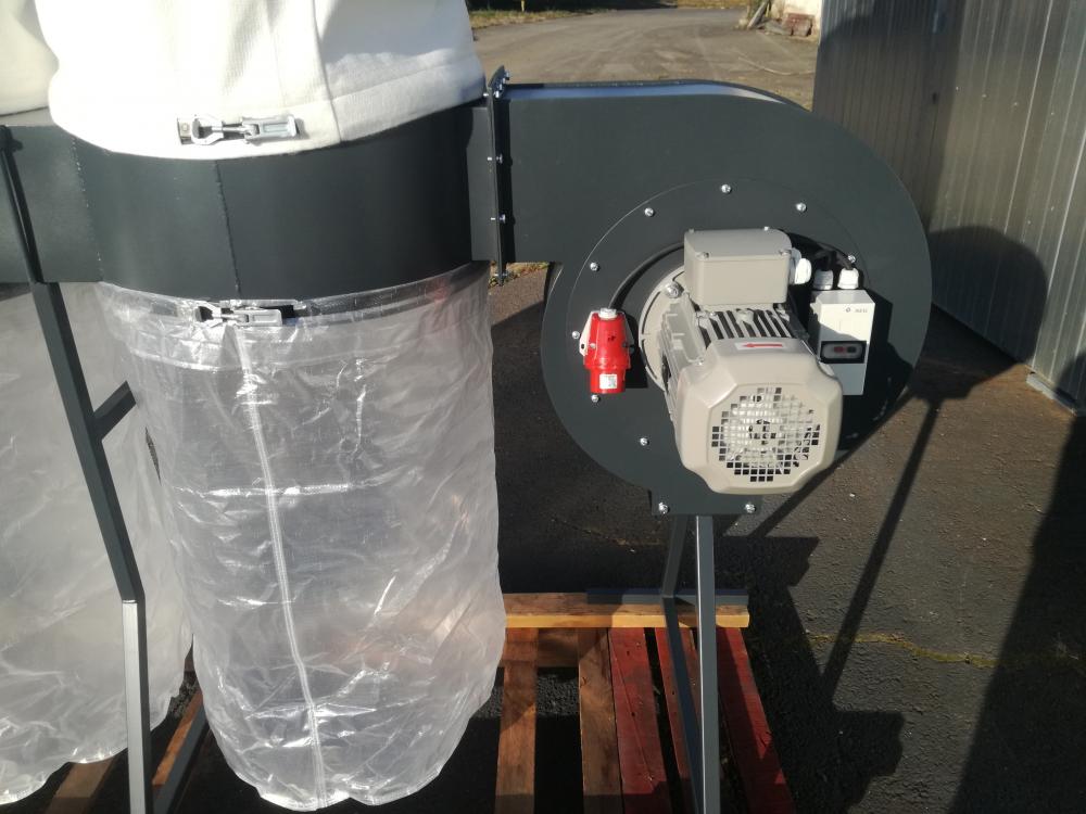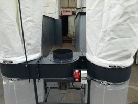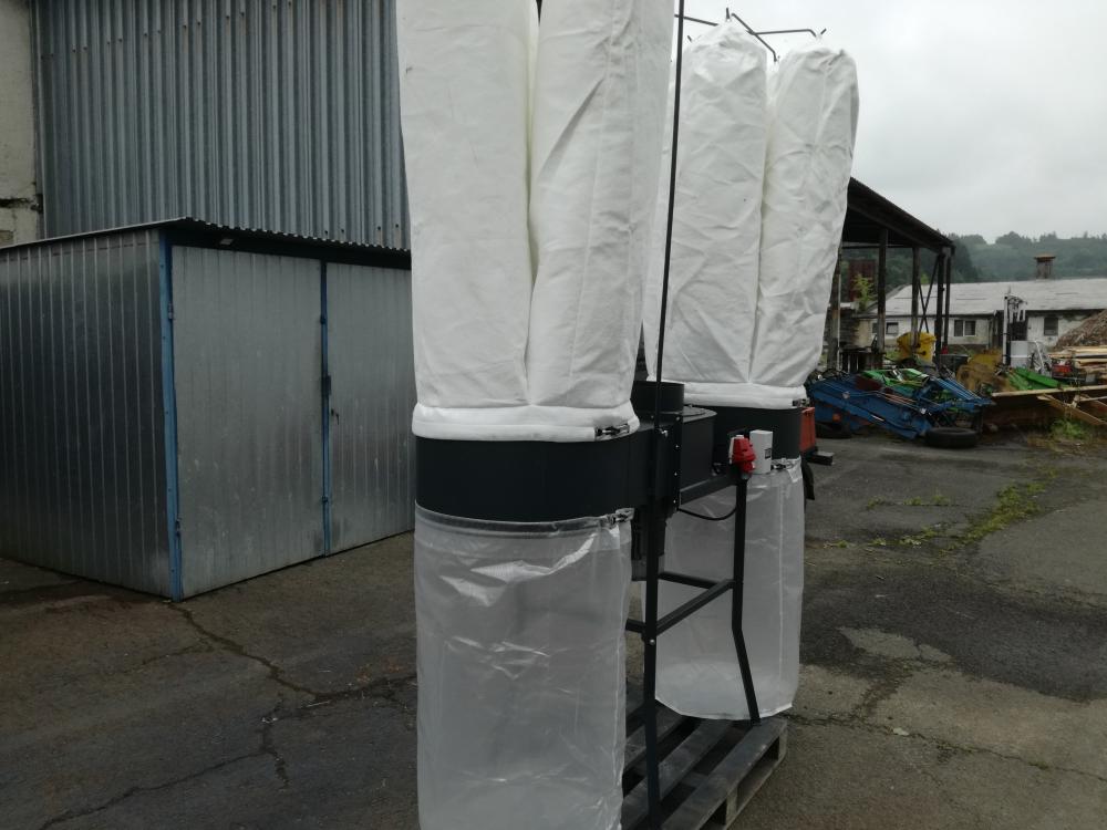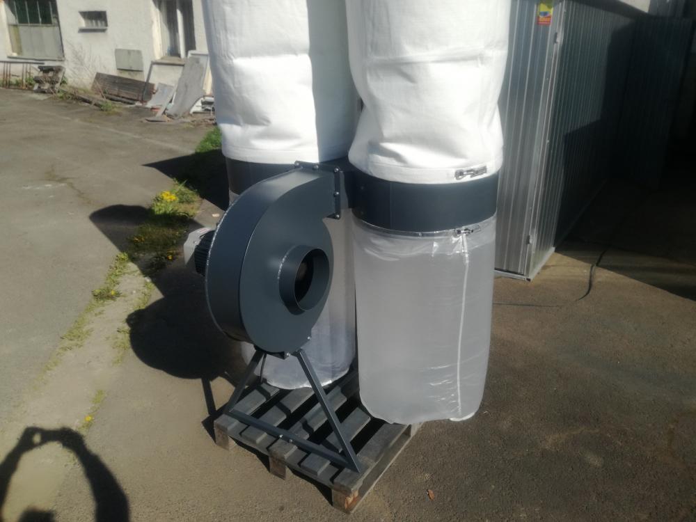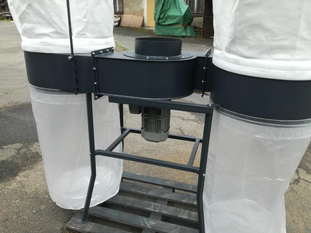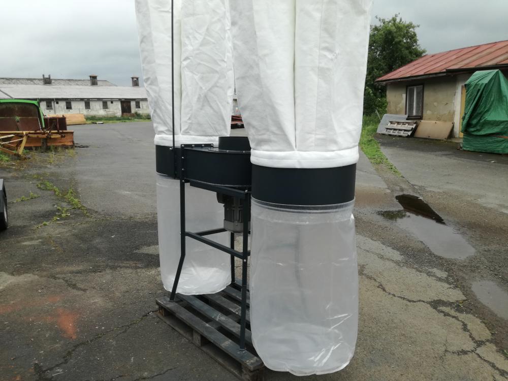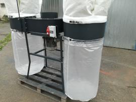 Vysoce výkonné dvoupytlové odsávání O7900, pro odsávání až od několika strojů současně. Pro srovnávačky, rozmítací pily, čtyřstranné frézy, okenní centra, jako centrální odsávání atd. Díky hadicovým filtračním vakům je odsávací kapacita 7900m3/h, max. odsávací rychlost 32m/s, filtrační plocha 12m2, připojovací sací hrdlo 300 mm, objem odpadních vaků 0,66m3, pevný svařovaný rotor, robustní provedení, vrtule z tloušťky 4mm, lopatky 3mm, plášť ventilátoru 3mm. Nový typ hliníkového kvalitního přírubového elektromotoru 3kW - 2900 ot/min. Přívod 16A – 5 kolík. Odsává i drobné kousky dřeva a vlhké řezivo. Uvedená cena je za odsávání včetně 2 horních hadicových filtračních, a 2 dolních zesílených silonových odpadních vaků a kovových upínacích pásek. Rozměry - d. = 2000, š. = 700, v. = 2800.