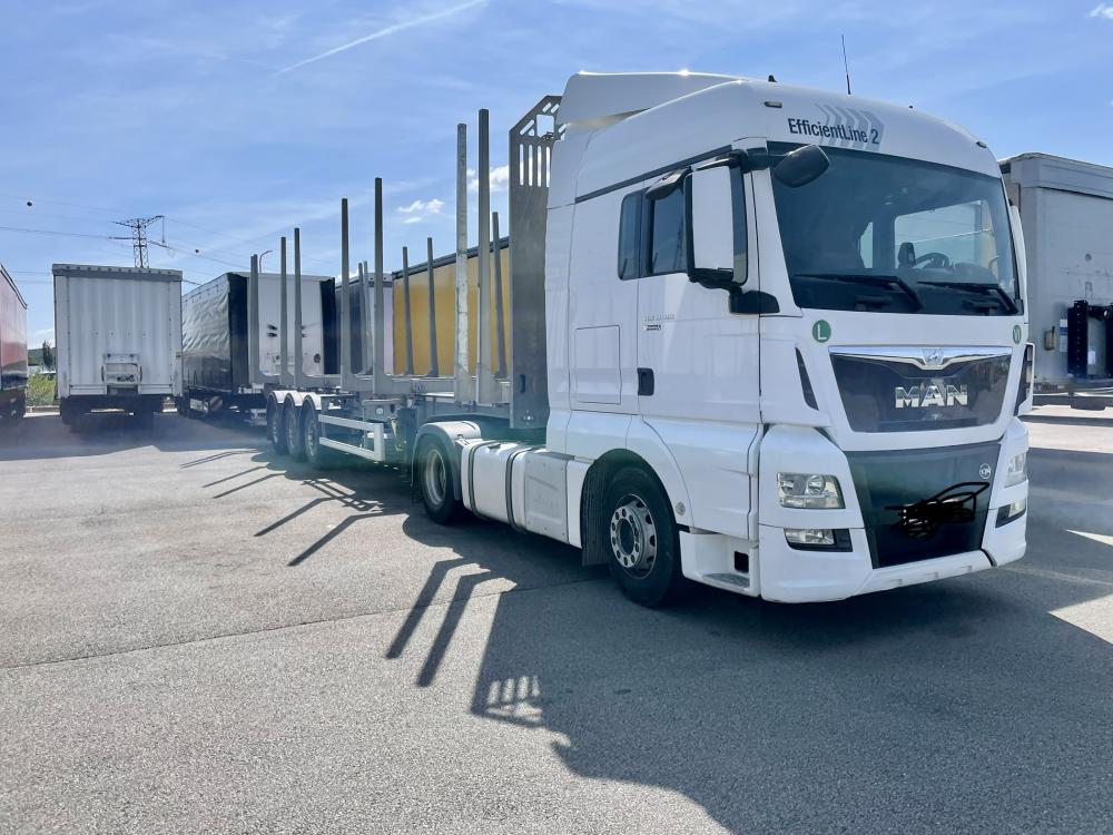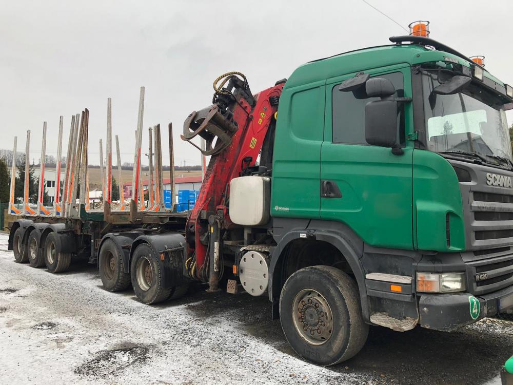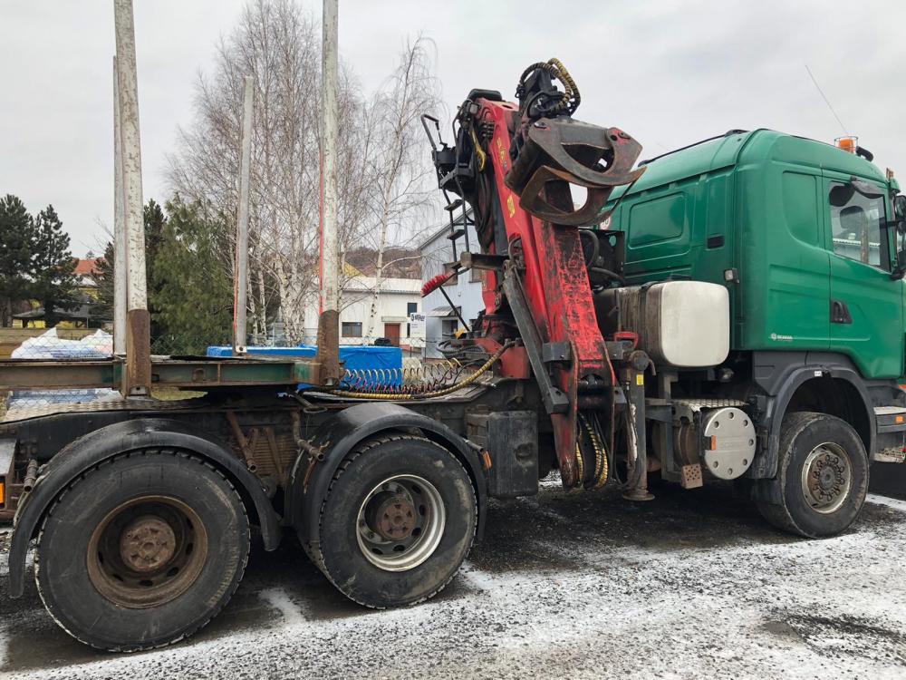 Scania R 420, 6x6 + hydraulická ruka Epsilon E165Z95 - r.v.2008. Klanicový návěs, 10 párů posuvných klanic pro odvoz dřeva, výrobce - Lemex NTZ 33, r.v 2008.