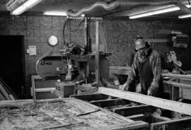 Poté to jde do stahovacího turniketu pro první lepení. "Hoši, kteří to dělají se dívají na konec každé latě, aby určili vzor kresby, který se objeví na konečném povrchu krájecího prkénka. Oni skládají tu báječnou směsici kreseb", říká Don Beamish.