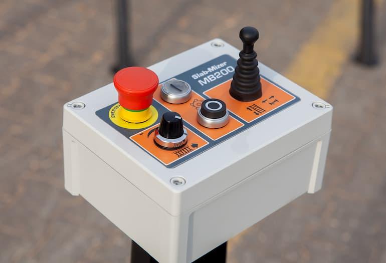 Řezná hlava se startuje a ovládá z ovládací konzole. Pomocí dlouhého kabelu ji můžete umístit z jakékoli strany stroje. Tato konzole je upevněna k ocelové stojánce. Ovládání zahrnuje zapnutí/vypnutí, proměnnou rychlost podávání a ovládání joysticky pro osy X a Y pro dokončení materiálu po nebo proti vláknu.
