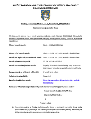Mestský podnik lesov Medzev, s. r. o., vyhlasuje verejnú dražbu dreva (aukciu), ktorá sa bude konať v dňoch: 17. 03. – 21. 03. 2025, každý deň so začiatkom o 8,30 hod.
