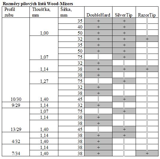 Wood-Mizer vyrábí tři řady pilových pásů: DoubleHard (dvojnásob tvrdý), SilverTip (stříbrná špička) a stelitem opatřená špička RazorTip (ostří břitvy).