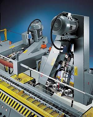Základ stroja je tvorený pevnou oceľovou konštrukciou. Podávacie zariadenie sa skladá z reťaze s gumovými oteruvzdornými doštičkami. Doštičky a klzné časti reťaze sú vymeniteľné. Horný prítlačný trámec je vybavený dvoma radami pogumovaných koliesok s ložiskami, priečne nastaviteľnými tak, že brúsiace jednotky môžu opracovávať dielce rôznych rozmerov.